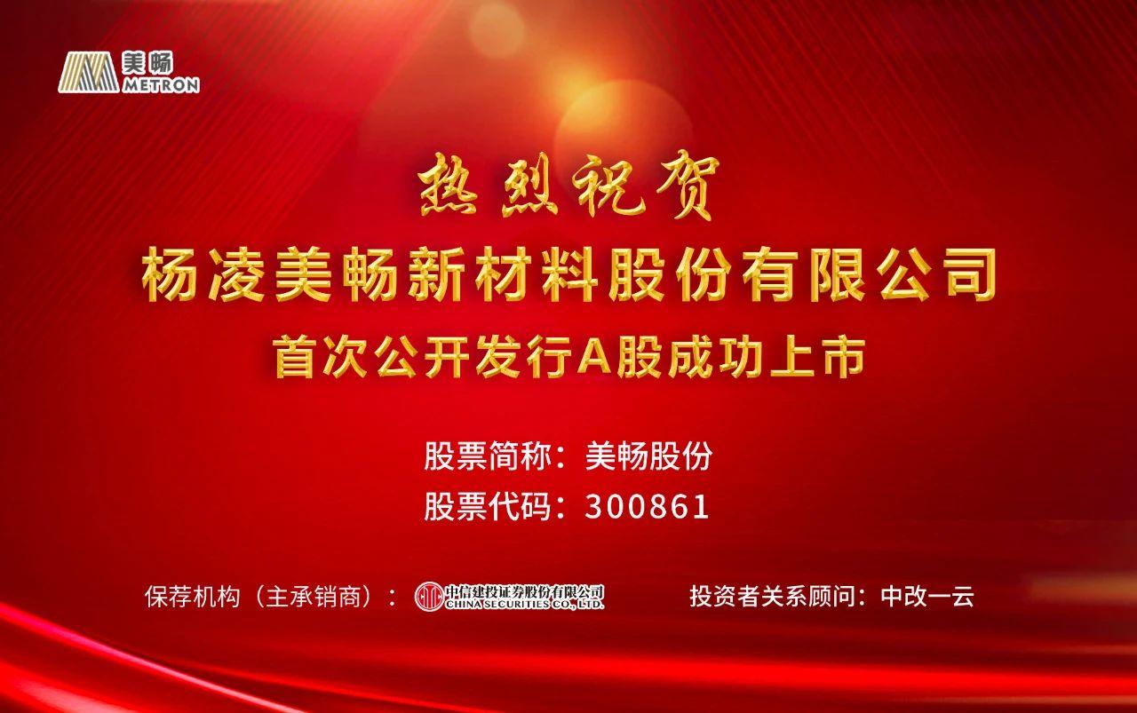 美畅股份A股股本为40,001.00万股,其中3,757.5780万股于今日起上市交易,发行价43.76元/股,募集资金总额175,083.76万元,保荐机构(主承销商)为中信建投证券股份有限公司。
