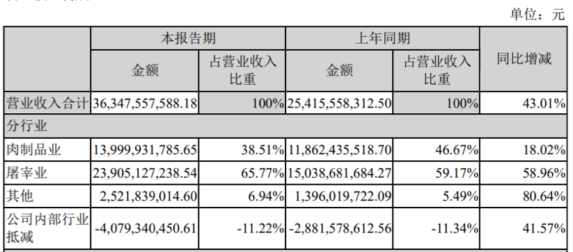分行业看,双汇发展的营业收入主要来源于屠宰业和肉制品业,上半年分别实现营业收入239.05亿元和140亿元,分别同比增长58.96%和18.02%,占营业收入的比重分别为65.77%和38.51%。