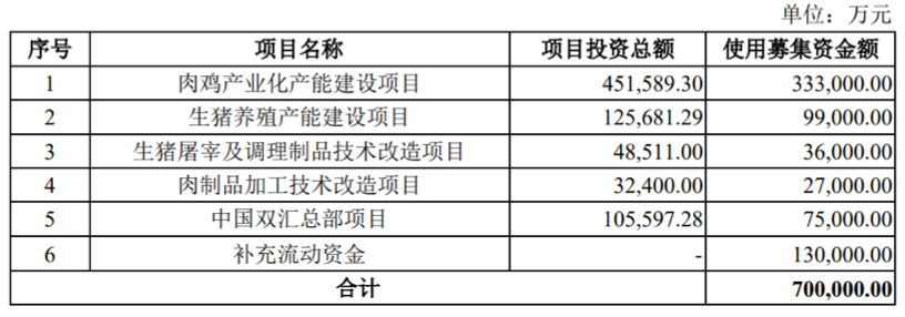 具体来看,双汇发展本次募集的70亿元资金,将有33.3亿元用于肉鸡产业化产能建设项目,13亿元用于补充流动资金,9.9亿元用于生猪养殖产能建设项目,7.5亿元用于中国双汇总部项目。