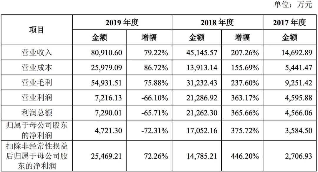 据招股书数据可知,报告期内,该公司的营业成本分别为0.54亿元、1.39亿元和2.60亿元。2018年及2019年较上一年增幅分别高达155.69%和86.72%。