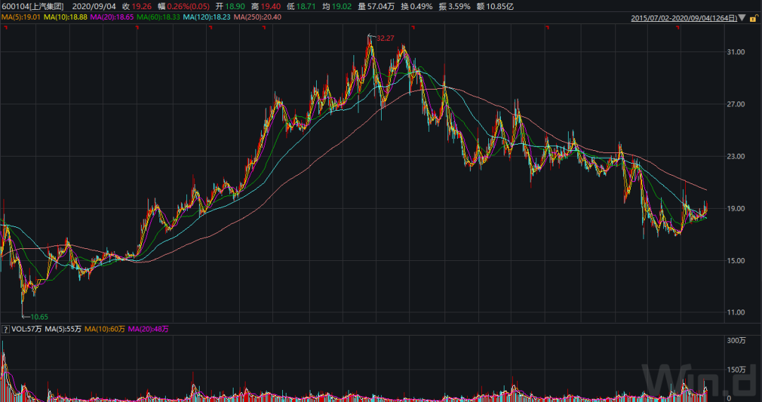 截至2020年9月7日,上汽集团报收于19.4元/股,较历史高点下挫40%。