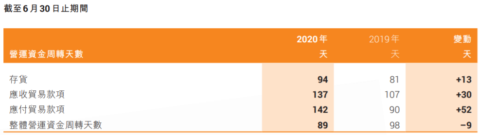 而其营运资金周转天数指标亦不太乐观。今年上半年,该公司平均存货周转天数为94天、平均应收贸易款项周转天数137天、平均应付贸易款项周转天数为142天;分别较去年同期增加13天、30天、52天。报告期内,整体营运资金周转天数为89天,同比减少9天。