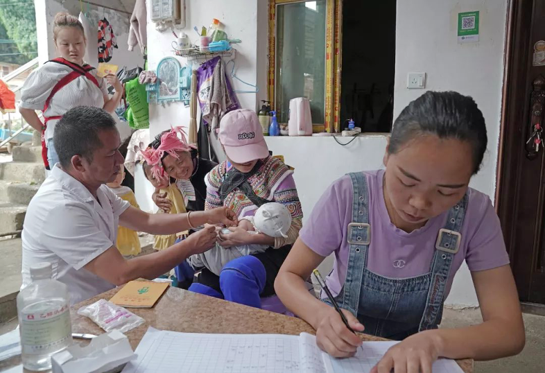 李玉忠正在给寨子里的婴儿打疫苗。学医的儿媳妇在做疫苗注射的登记备案。