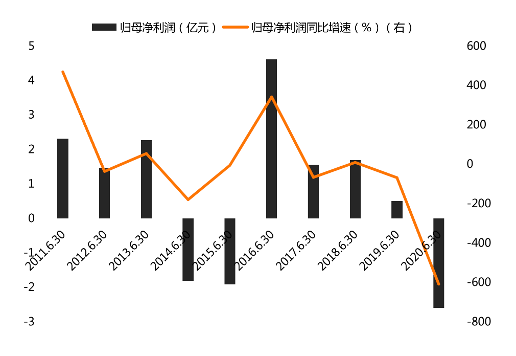 若选取半年度数据为分析基准,将时间维度拉长来看,《投资时报》研究员发现,2011年上半年至2020年上半年,该公司归母净利润同比增速波动过大,且已由2011年的469.19%暴降至2020年的-608.83%,降幅超1000个百分点,虽然该指标数据曾于2016年上半年上冲至341.98%,但整体已然呈现下滑趋势,在一定程度上反映出该公司盈利能力开始走弱。
