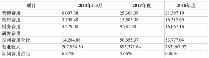 由于,偏光片的制造需要综合精密机械、光学和化工等技术,具有较高的技术含量和技术壁垒。《投资时报》研究员留意到,2018年、2019年及2020年一季度,标的资产“四费”合计分别为5.38亿元、5.07亿元、1.43亿元,费用占营收比重分别为6.86%、5.66%、6.87%,其中,研发费用均显示为零。