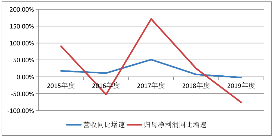 杉杉股份2015年-2019年营收及归母净利润同比增速(%)