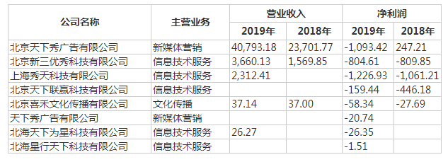 但在“关于对上海证券交易所2019年年度报告问询函的回复公告”(下称回复问询函)中可以看到,2018年、2019年,控股子公司北京天下秀营收分别为2.37亿元、4.08亿元,净利润分别为247.21万元、-1093.42万元,2019年北京天下秀营收与净利润严重背离,而其在2020年上半年不仅翻番完成上年全年营收指标、净利润还大幅度转正。