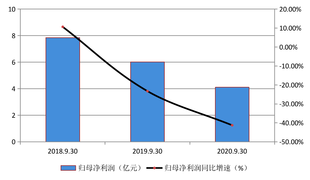 但是,如果把时间线拉长,选取其前三季度业绩数据作为分析基准,《投资时报》研究员发现,2018年前三季度至2020年前三季度,其营收增速分别为9.89%、-4.48%、-18.09%,归母净利润增速分别为10.64%、-23.28%、-41.29%,营收及归母净利润增速已呈持续下降态势。