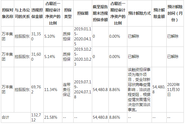 《投资时报》研究员注意到,截至2020年9月30日,万丰奥威仍有对控股股东5.45亿元违规担保尚未解除,占最近一期经审计净资产的8.86%。据三季报显示,此笔担保的担保期为2019年7月19日至2024年7月18日,预计解除时间为2020年11月30日。但是,考虑到海外疫情尚不稳定,此笔海外融资担保能否按期解除,尚还待定。