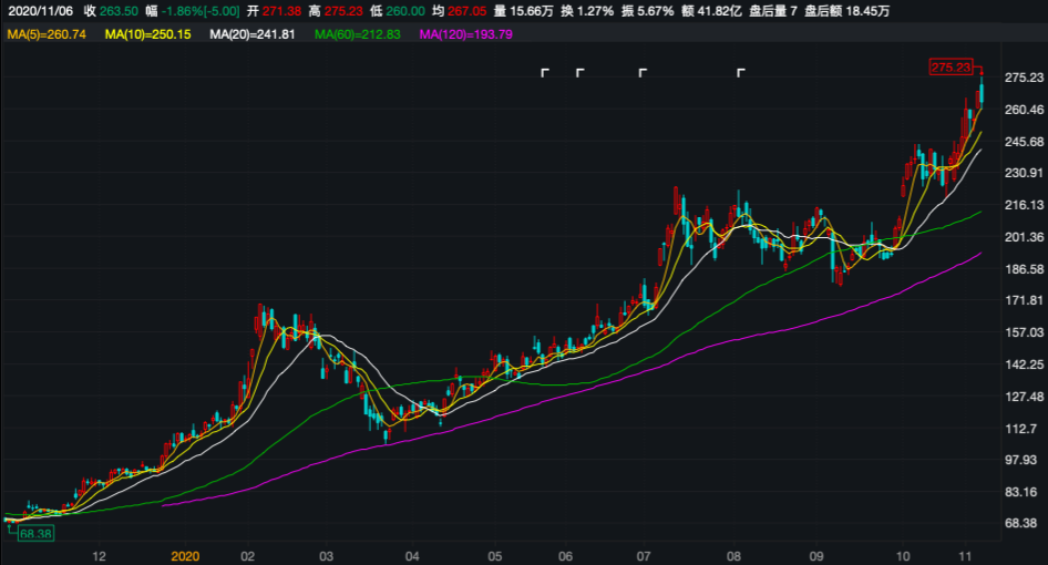 作为国内动力电池的行业龙头,截至2020年11月6日,宁德时代在二级市场上的收盘价为263.50元/股,其总市值超6000亿元。