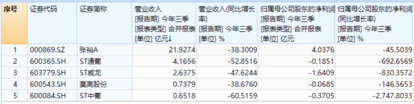 仅有的实现盈利的是烟台张裕葡萄酿酒股份有限公司(下称张裕A,000869.SZ),今年前三季度,该公司实现营业收入21.93亿元,实现归母净利润4.04亿元,但仍同比分别减少38.30%和45.50%。