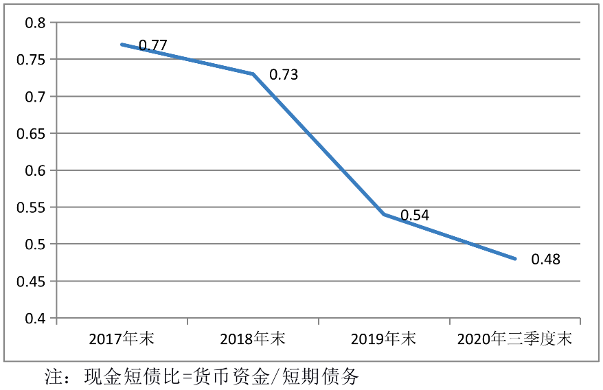 今年三季报数据显示,截至9月末,该公司货币资金为70.34亿元;短期借款、一年内到期的非流动负债分别为113.08亿元、32.77亿元,二者合计组成短期债务145.85亿元。以此计算,其现金短债比只有0.48倍,也就是说货币资金只够覆盖48%左右的短期负债。货币资金与短期债务之间存在75.51亿元的缺口,而前三季度该公司经营活动产生的现金流量净额仅17.50亿元——这已是2017年以来同期最好水平。