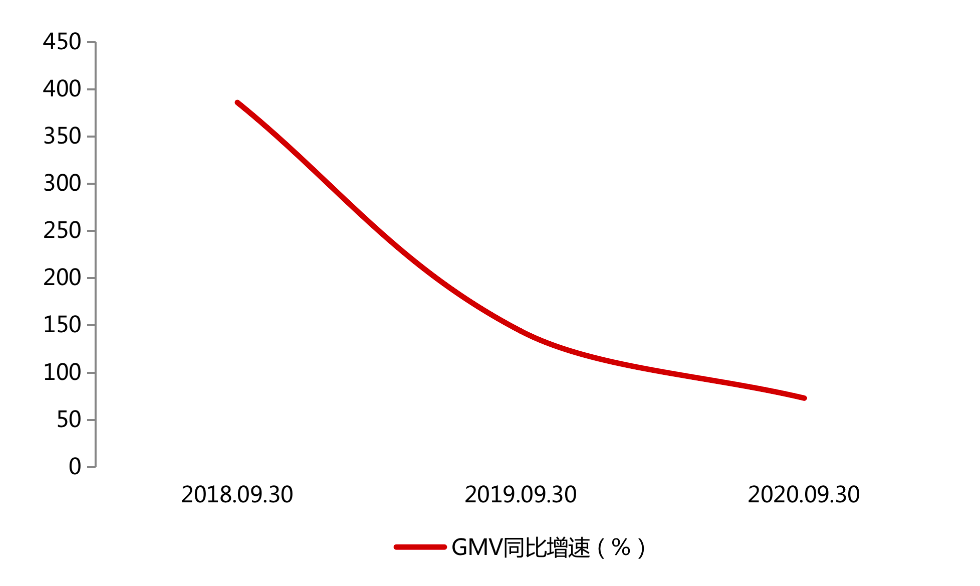 可以看到,自2018年9月底至2020年9月底,该公司GMV同比增速分别为386%、144%、73%,即便各年报告期内其GMV同比增速均为正值,但GMV同比增速已然大幅放缓。
