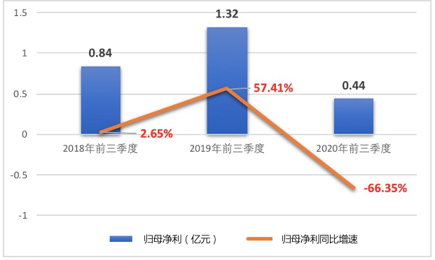 香飘飘2018年前三季度—2020年前三季度归母净利润及增速
