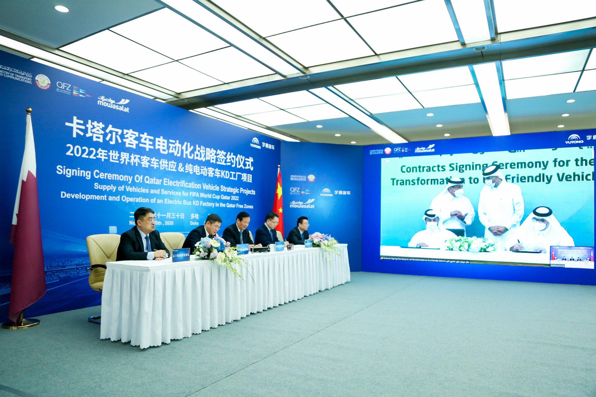 卡塔尔首相兼内政部长哈立德、卡塔尔交通与通讯大臣苏莱提、中国驻卡塔尔国特命全权大使周剑、使馆经商处参赞杨松及卡塔尔相关部委、各驻外使节出席签约仪式。Mowasalat 首席执行官法赫德、自由区副总裁阿卜杜拉、宇通集团董事长汤玉祥进行了线上签约。