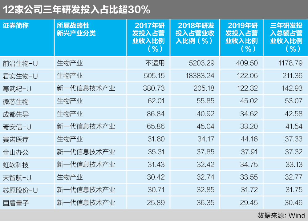 研究结果显示,三年研发投入(指2017年—2019年,下同)合计超过10亿元的公司有13家,包括中芯国际(688981.SH)、中国通号(688009.SH)等。综合研发投入和营业收入计算,前沿生物(688221.SH)、君实生物(688180.SH)、寒武纪(688256.SH)等公司的三年研发投入占比(指研发投入在营业收入中的占比,下同)排名前列。按战略性新兴产业分类,生物产业整体三年研发投入占比领先,新一代信息技术产业这一比例也超过10%。