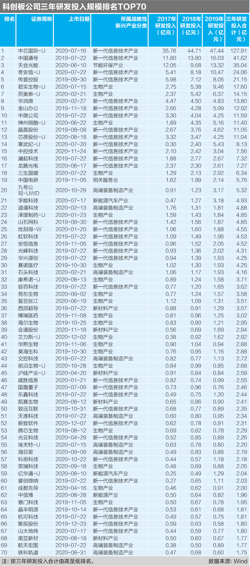 此外,三年研发投入合计在5亿—10亿元之间的科创板公司有7家;在1亿—5亿元之间的有94家;不足1亿元的有86家。