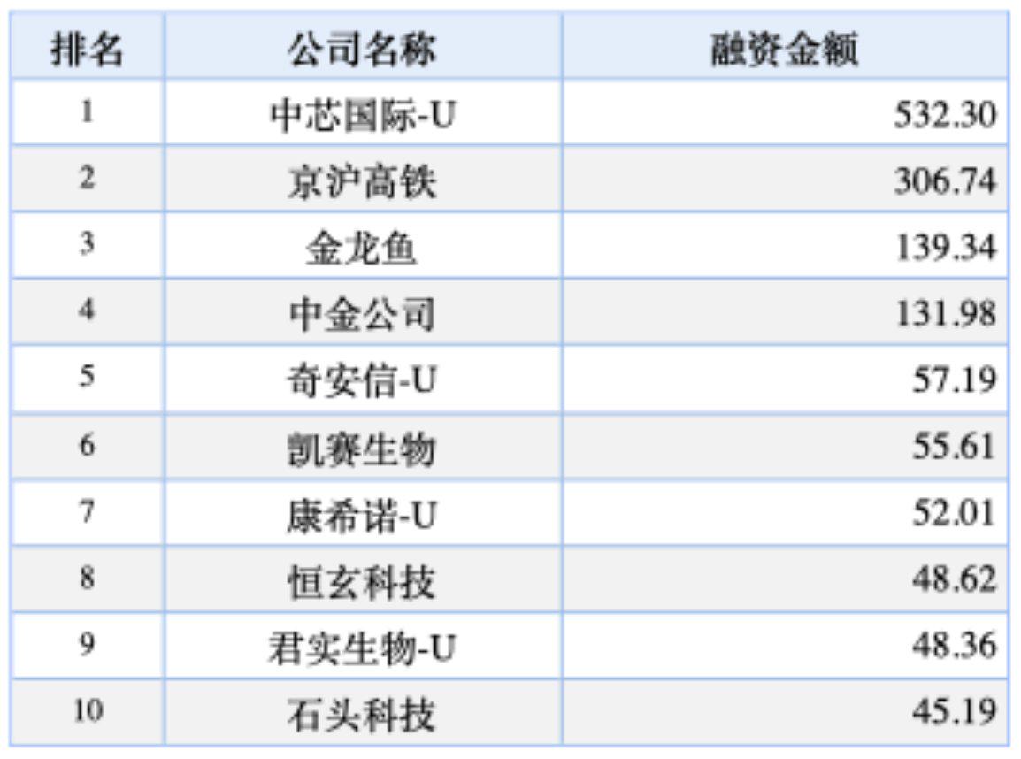 而今年以来前十大IPO公司中,登陆科创板的公司就占据7个,分别为中芯国际-U、奇安信-U、凯赛生物、康希诺-U、恒玄科技、君实生物-U、石头科技,募资额分别为532.3亿元,57.19亿元、55.61亿元、52.01亿元、48.62亿元、48.36亿元、45.19亿元。其余三家公司分别为登陆主板的京沪高铁和中金公司,募资额分别为306.74亿元、131.98亿元,以及以139.34亿元募资额登陆创业板的金龙鱼。
