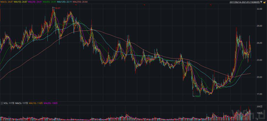 截至2021年1月20日,上汽集团报收于23.45元/股,较2020年11月6日触及的28.8元/股高点下挫18.6%,市值为2739.77亿元。