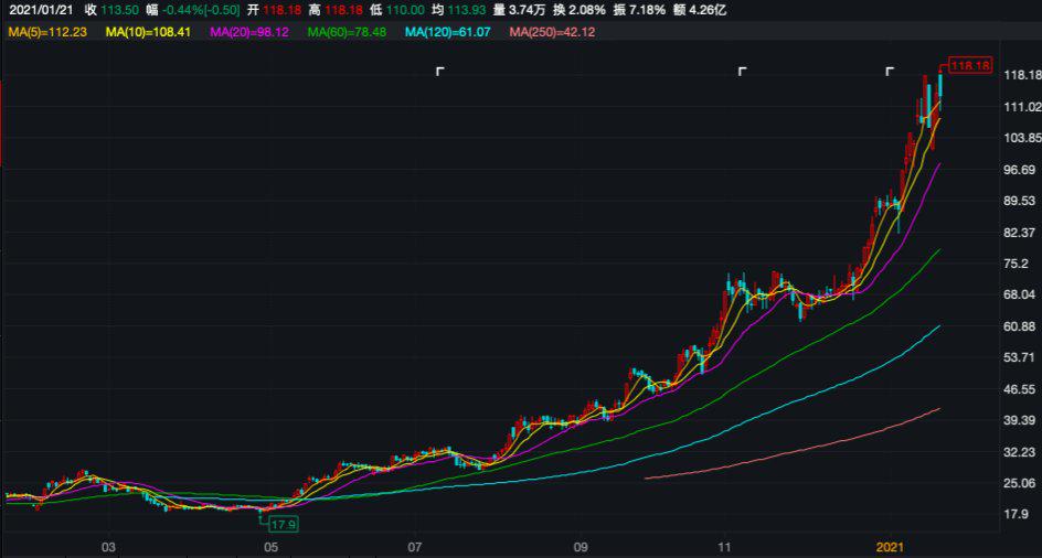 业绩预增公布当天,该公司股价上涨6.37%,但随后的三个交易日,其股价变动幅度分别经历了下挫1.56%、涨停与跌停。截至2021年1月21日,科沃斯股价收于113.50元/股(不复权,下同),日跌幅为0.44%。