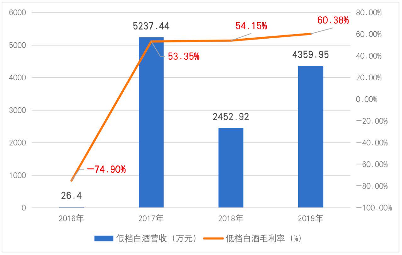 然而,《投资时报》研究员梳理水井坊近年财报发现,在接下来的四年间,该公司低档白酒所贡献的营收却猛增近30倍,且其毛利率也自2017年起,直逼该公司的主营产品中高档白酒。