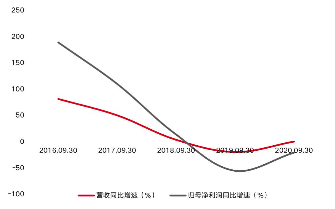 进一步分析来看,若以该公司各年前三季度业绩数据为分析基准,《投资时报》研究员注意到,其归母净利润同比增速已由2016年前三季度的107.6%大幅下降至2020年前三季度的-21.04%,降幅超120个百分点;同时间区间内,营收同比增速也由81.43%骤降至0.27%,降幅超80个百分点。