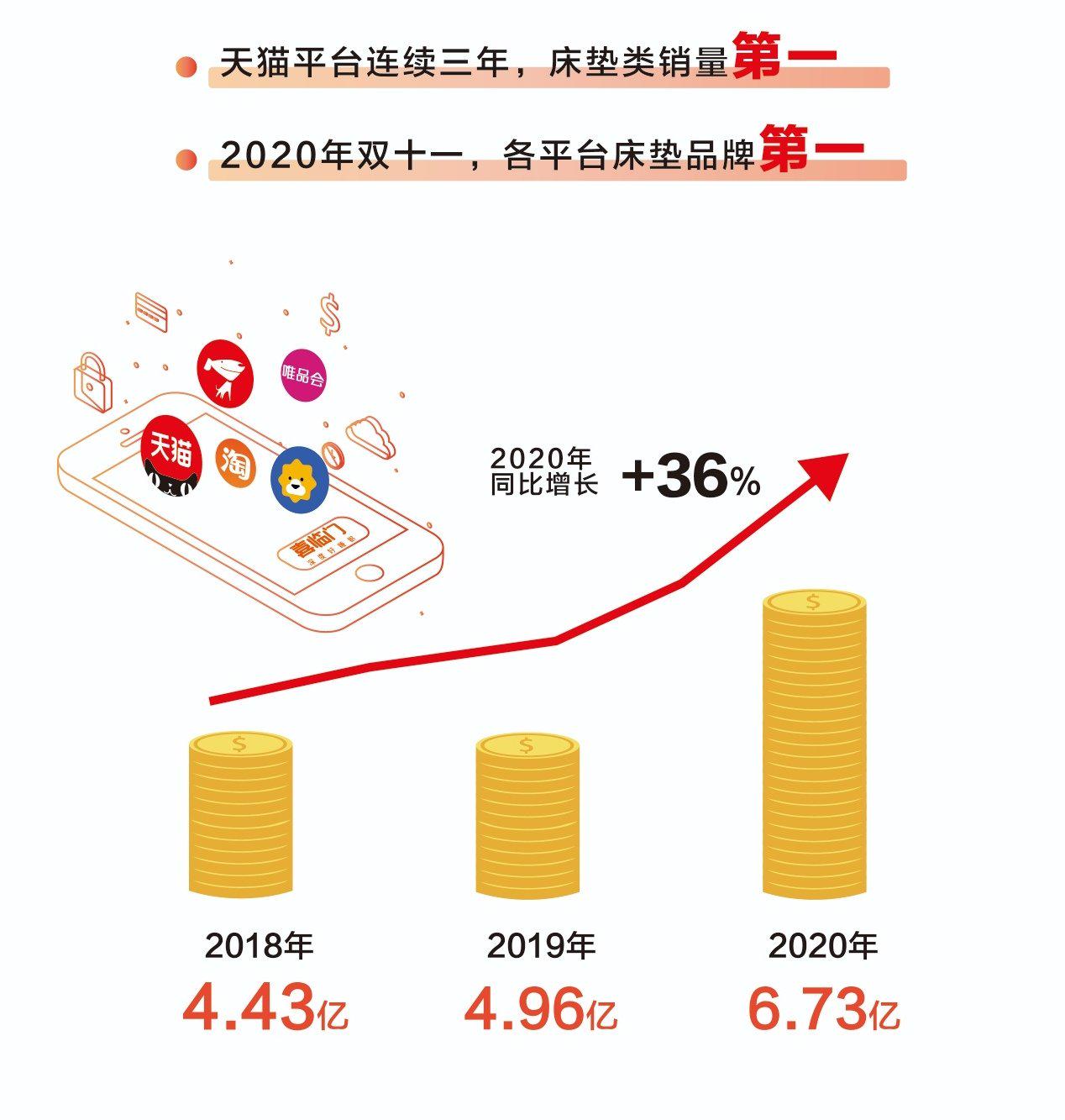 借助天猫、京东、苏宁等各大电商平台,以及开设自主品牌旗舰店或自营店网络,喜临门亦实现全平台覆盖线上消费群体。据天风证券研报显示,2017年至2020年,该公司线上销售收入分别为3.50亿元、4.43亿元、4.96亿元、6.73亿元,2018年至2020年同比增幅分别为26.62%、12.08%、35.55%。