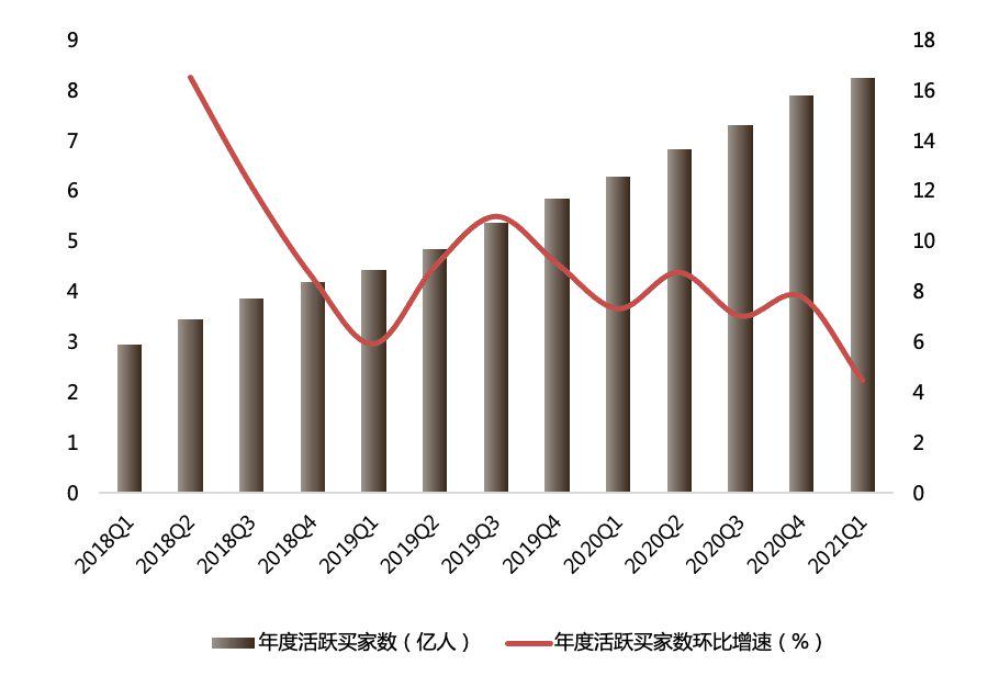 数据显示,截至2021年一季度末,该公司平台年活跃买家数达8.238亿,首次突破8亿大关,较上个季度的7.884亿增加3540万人,增速约为4.49%。