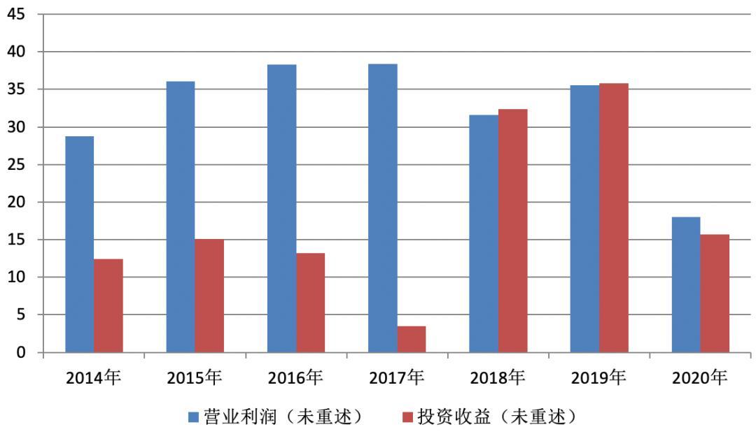 值得一提的是,在上述五个会计年度,该公司未经重述的投资收益分别为12.42亿元、15.13亿元、13.18亿元、3.53亿元和32.35亿元,分别占到各年度营业利润的43.19%、41.92%、34.42%、9.19%、102.39%。从数据来看,投资收益所占营业利润比值较大,尤其是2018年,投资收益竟然完全覆盖该年度营业利润。