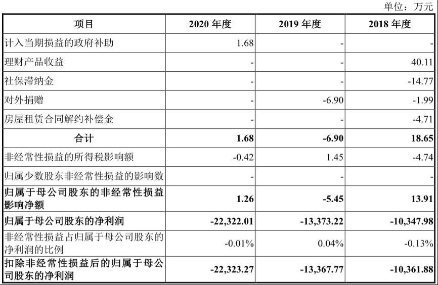同期,索元生物扣除非经常性损益后归属于母公司股东的净利润分别为-1.04亿元、-1.34亿元、-2.23亿元,合计高达-4.61亿元。截至2020年12月31日,该公司累计未分配利润为-4.98亿元。