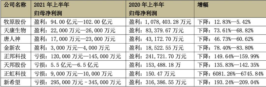 据已经披露业绩预告的上市公司数据显示,牧原股份(002714.SZ)、天康生物(002100.SZ)、唐人神(002567.SZ)、金新农(002548.SZ)等企业归母净利润为正值;正邦科技(002157.SZ)、天邦股份(002124.SZ)、正虹科技(000702.SZ)、新希望(000876.SZ)等归母净利润则呈现出亏损态势。不过整体来看,前述8家公司2021年上半年净利润同比增速预计均呈下降态势。
