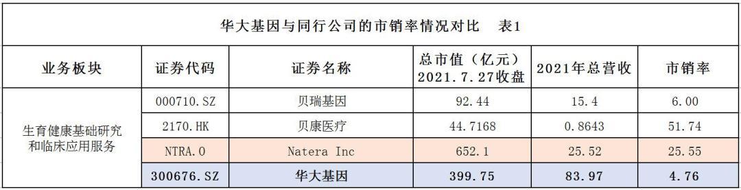 综合考虑在每个业务领域选取一个业务体量或服务模式较为接近的企业,对应五个加起来市值总和是1,018亿元(贝瑞92+泛生子75+圣湘生物314+诺禾196+安图生物341),而截至7月27日收盘,华大基因总市值约400亿元。估值优势明显。