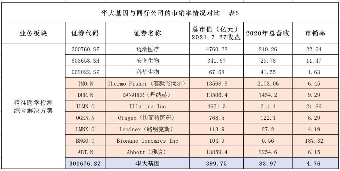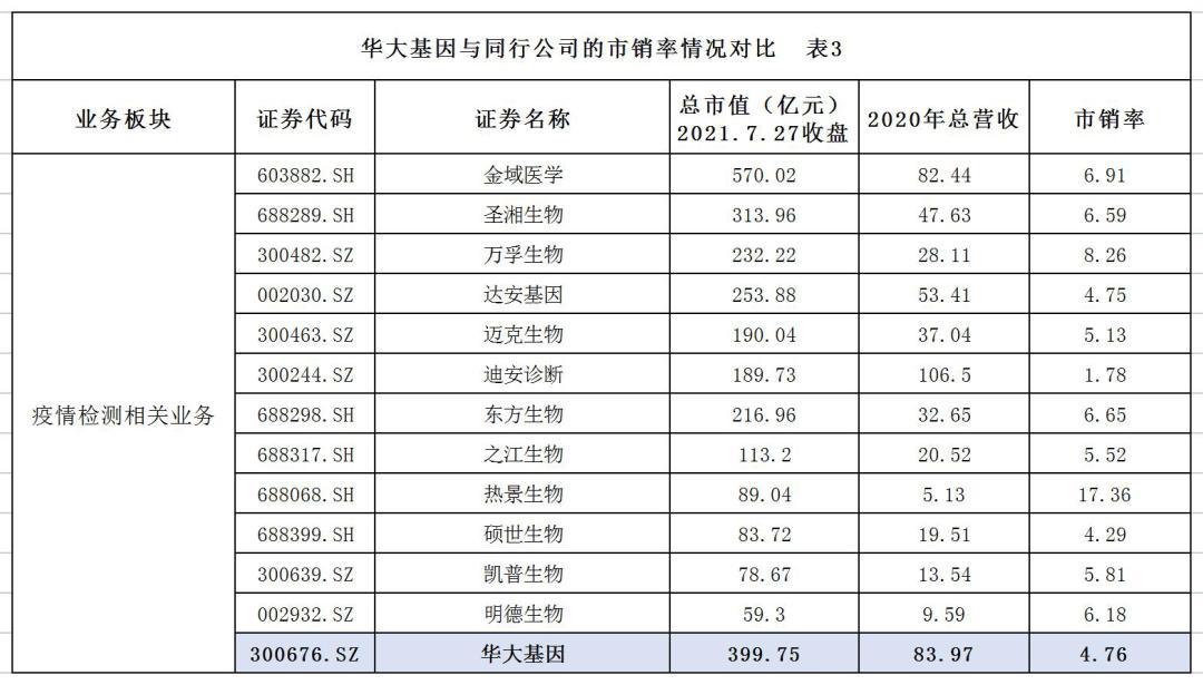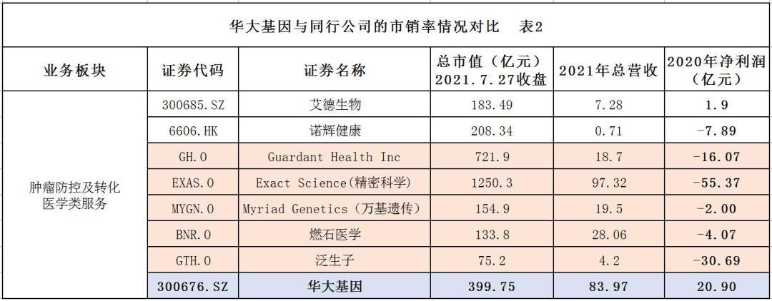 对比行业,目前全球IVD综合市盈率为34.8倍。但截至7月27日收盘,华大基因的静态市盈率为19.12倍,远低于行业平均估值水平,以2020年净利润20.9亿元计算,比照34.8倍市盈率,