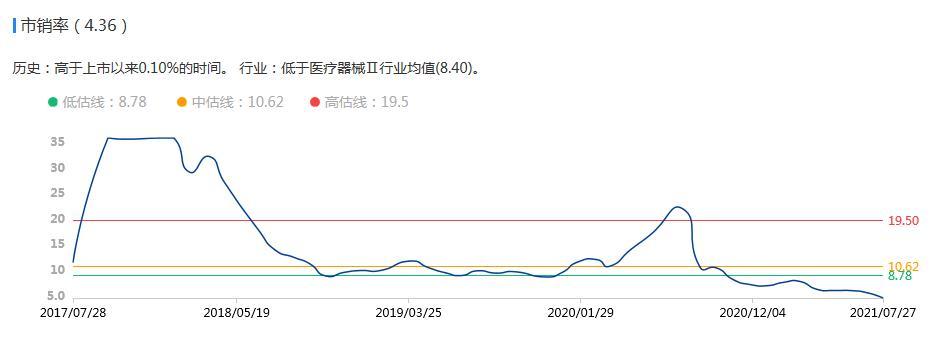 纵向对比,华大基因自上市以来市销率的低估线、中估线和高估线的分位值分别为8.78、10.62和19.5,估值跨度很大主要是前期估值很高,同时2020年因疫情的缘故,导致与2019年的总营收数据有很大差别。
