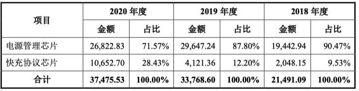 2018年、2019年和2020年(下称报告期),英集芯的营业收入分别为2.17亿元、3.48亿元和3.89亿元,年复合增长率达34.04%;其中,电源管理芯片的销售收入占主营业务收入的比例分别为90.47%、87.80%和71.57%;而快充协议芯片销售收入占比增长显著,占主营业务收入的比例分别为9.53%、12.20%和28.43%。2019年和2020年,英集芯的快充协议芯片销售收入分别同比增长101.22%和158.48%。