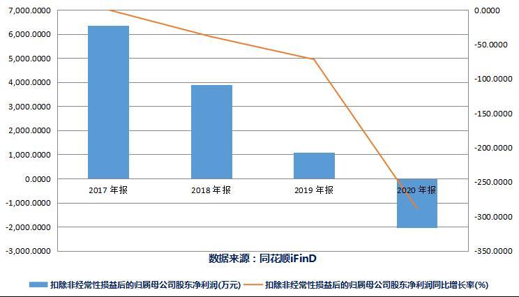与此同时,该公司扣非后净利润下滑更是严重。2018年至2020年的扣非净利润分别只有3888.22万元、1078.61万元和-2031.03万元。