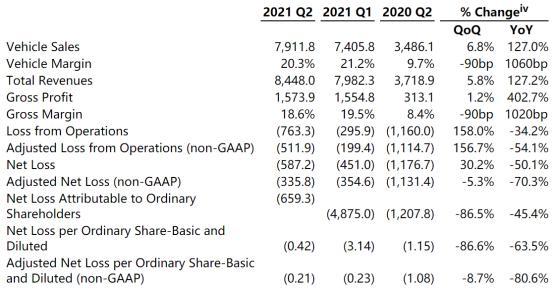 但是,该公司目前仍然没能实现盈利。今年第二季度,蔚来净亏损5.87亿元,与2021年第一季度亏损4.51亿元相比扩大30.2%。剔除基于股份的薪酬支出,2021年第二季度经调整的净亏损为3.36亿元。