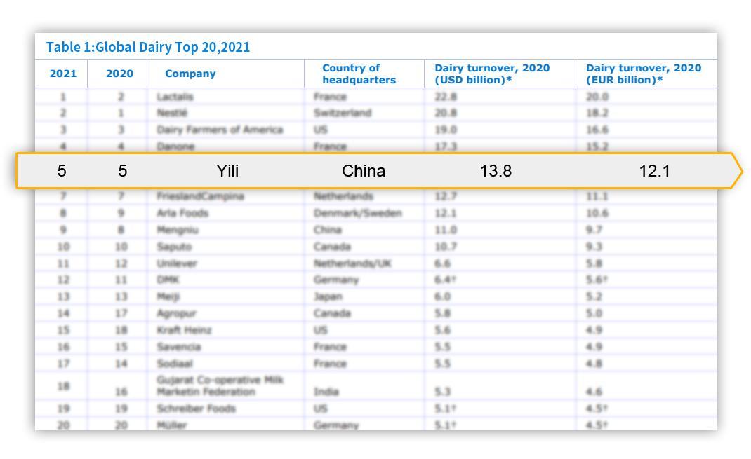 伊利蝉联全球乳业五强、连续8年稳居亚洲乳业第一