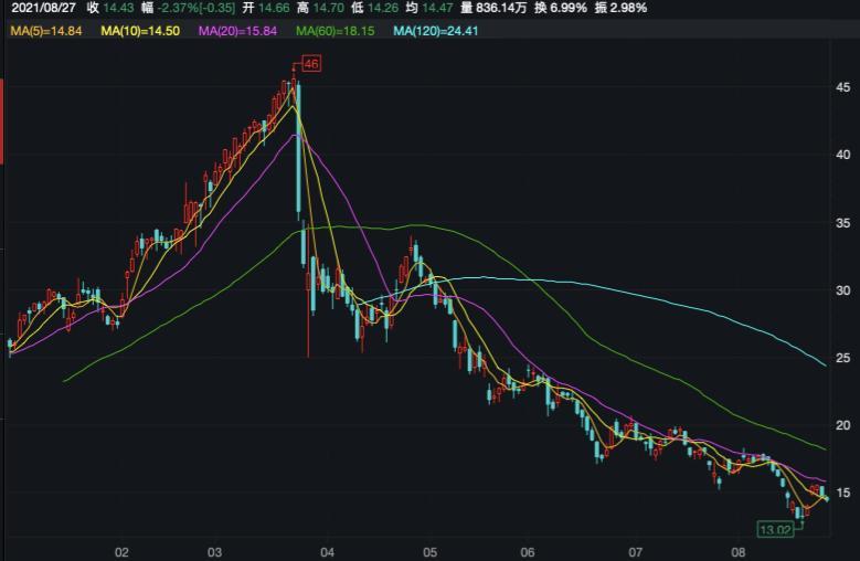 截至8月27日美东收盘,唯品会报收于14.43美元/股,也即仅在5个月的时间内,股价已缩水68.63%。