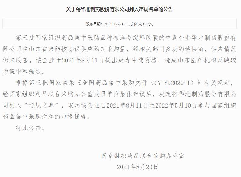 据公开资料显示,8月20日,上海阳光医药采购网发布公告,由于华北制药在山东省未能按协议供应布洛芬缓释胶囊约定采购量,经国家组织药品联合采购办公室成员单位集体审议后,决定将该公司列入“违规名单”,取消该公司自2021年8月11日至2022年5月10日参与国家组织药品集中采购活动的申报资格。