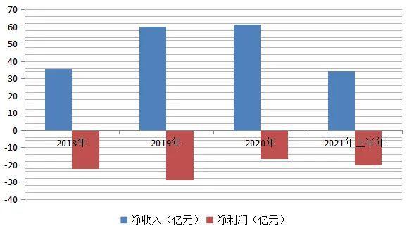 总体来看,今年上半年,该公司净收入、净利润分别为34.25亿元、-20.44亿元,而自2018年至2021年上半年,公司已经累计净亏达88.34亿元。