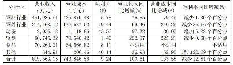 《投资时报》研究员注意到,傲农生物的营业收入主要来源于饲料业务及生猪养殖业务,饲料及养殖业务合计实现收入66.62亿元,占主营业务收入的81.28%。