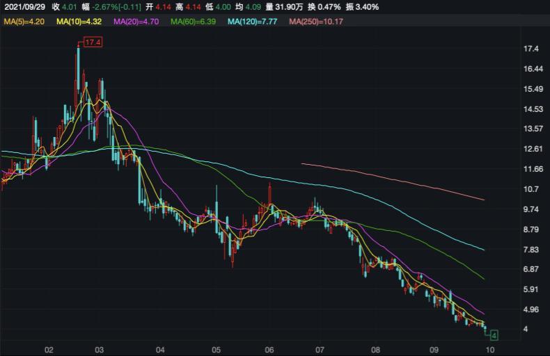 不过,值得注意的是,虽然收入与净利同比增长,但该公司股价却处于上市以来的低位。截至2021年9月28日,新氧收盘于4.12美元/股,较上市初期22.80美元/股峰值下挫八成;较今年17.40美元/股高位也已下挫76%,总市值仅4.3亿美元,与上市时的高光不可同日而语。