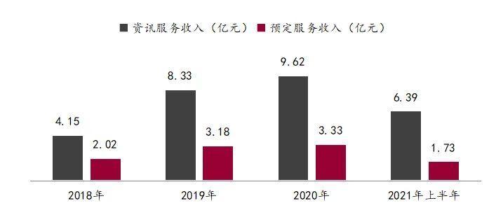 事实上,2018年至2020年,上述两项业务收入便呈现“此消彼长”现象。一方面,信息服务收入由4.15亿元逐年递增至9.62亿元,收入占比为67.3%、72.4%、74.3%;另一方面,预定服务收入虽由2.02亿元增至3.33亿元,但收入比却由32.7%递减至25.7%。可见,公司对资讯服务收入的依重度在加大。