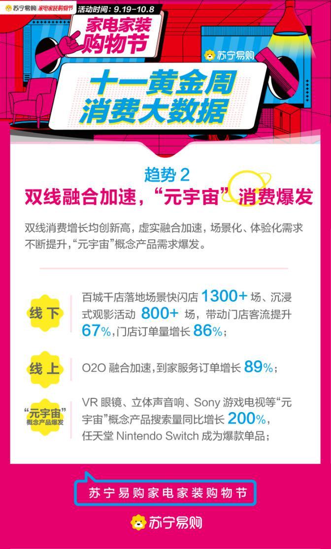 “虚实结合”的消费需求也向产品端延伸。数据显示,国庆期间,苏宁易购平台“元宇宙”概念产品爆发,VR眼镜、立体声音响、Sony游戏电视等产品搜索量同比增长200%,任天堂Nintendo Switch成为爆款单品。