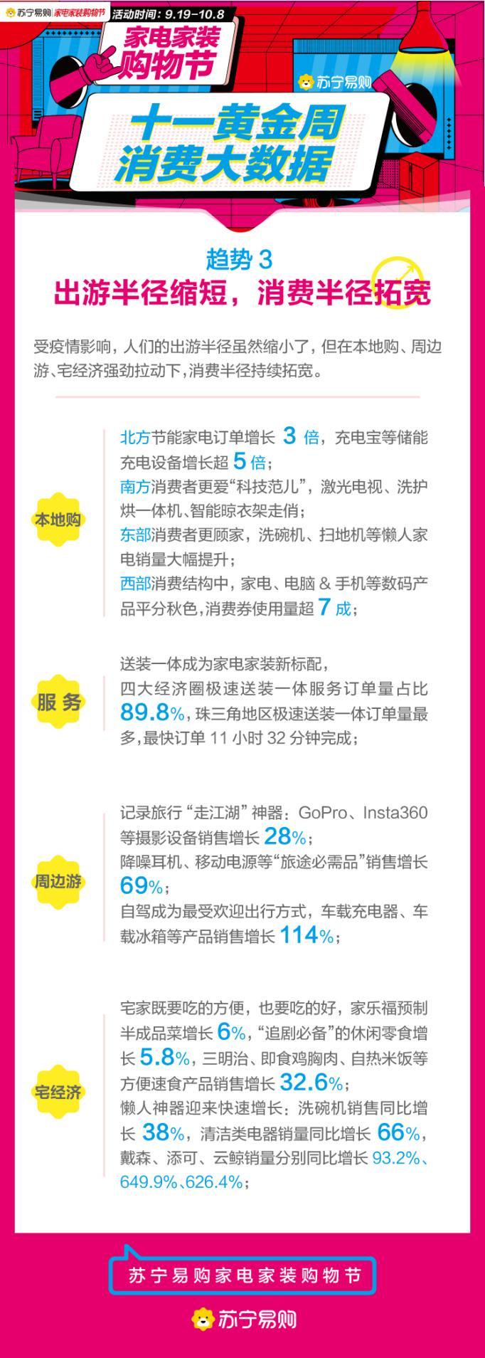 金秋家电家装黄金季,呈现“忙装修,不出游”的新趋势,送装一体成为家电家装新标配,苏宁易购四大经济圈极速送装一体服务订单量占比89.8%,珠三角地区极速送装一体订单量最多,最快订单11小时32分钟完成。