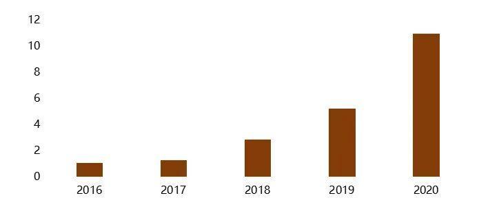 据Wind数据显示,2016年—2020年,该公司销售费用呈现出连续增加的趋势,且由2016年的1.07亿元上涨至2020年的10.99亿元,年复合增长率为79.02%;同时间周期内,销售费用率也由14.6%增长至41.74%。