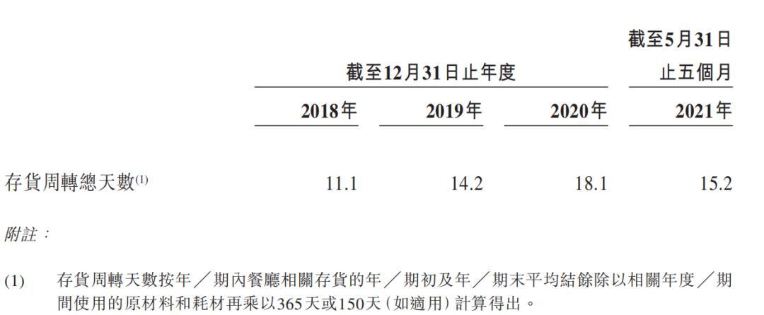 查阅绿茶集团招股书,《投资时报》研究员注意到,绿茶集团的存货包括食物和饮料及餐厅经营所用的其他材料。报告期内,公司存货余额分别为2040万元、2967万元、2947万元和4094万元,呈现不断上升趋势。同期存货周转天数分别为11.1天、14.2天、18.1天和15.2天,虽然2021年前五个月的存货周转天数有所下降,但是与2018年相比仍然上升了4.1个百分点。