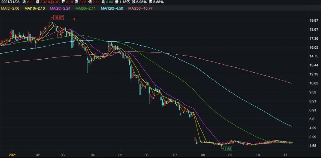 表现在股价上,自今年2月16日盘中触达19.97美元/股的历史最高点后,新东方股价一路持续下滑,截至11月8日美股收盘,新东方报收于2.11美元/股,已较最高点下跌89%,公司当前总市值仅为35.8亿美元。