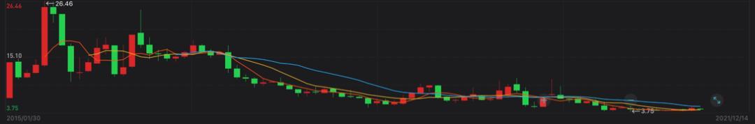 从二级市场股价走势来看,爱迪尔股价和市值自2015年上市冲高之后一路走低。截至2021年12月22日,爱迪尔收于4.54元/股,总市值约为20亿元,与上市之初的超百亿市值相比,已大幅跌去80%。